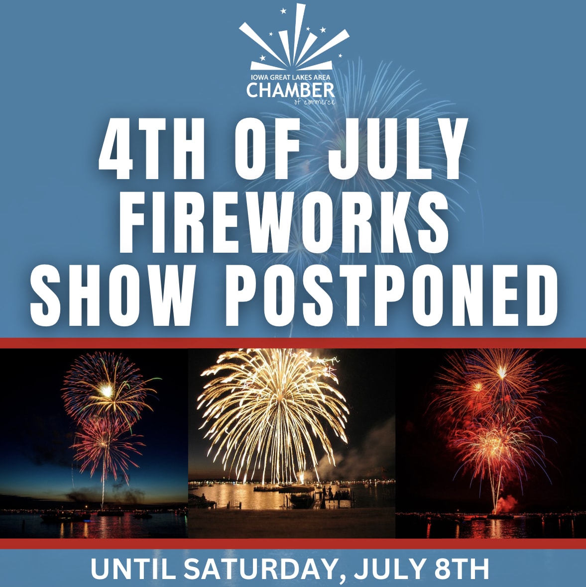 The Iowa Great Lakes Area Chamber of Commerce invites you to the annual 4th of July Fireworks celebration on Sunday, July 4, 2023. For over 45 years, with additional help from many generous business owners and private citizens, the Iowa Great Lakes Area Chamber of Commerce has funded and produced the annual 4th of July Fireworks celebration over West Lake Okoboji and filled our Okoboji sky with color and excitement. This tradition draws thousands of spectators to our beautiful lakes area to celebrate our nation’s birthday and honor the patriotism of those who made our independence possible. We encourage families to come out and spend a day at Arnold’s Park Amusement Park and then pop up a lawn chair or spread out a blanket on the lawn at Preservation Plaza and get ready to enjoy this truly spectacular fireworks display. Spending your day on the water, that's okay...arrive by boat for the most up-close and personal view. The memories this event creates for generations begins with your donations. Any donation - big or small, goes a long way!