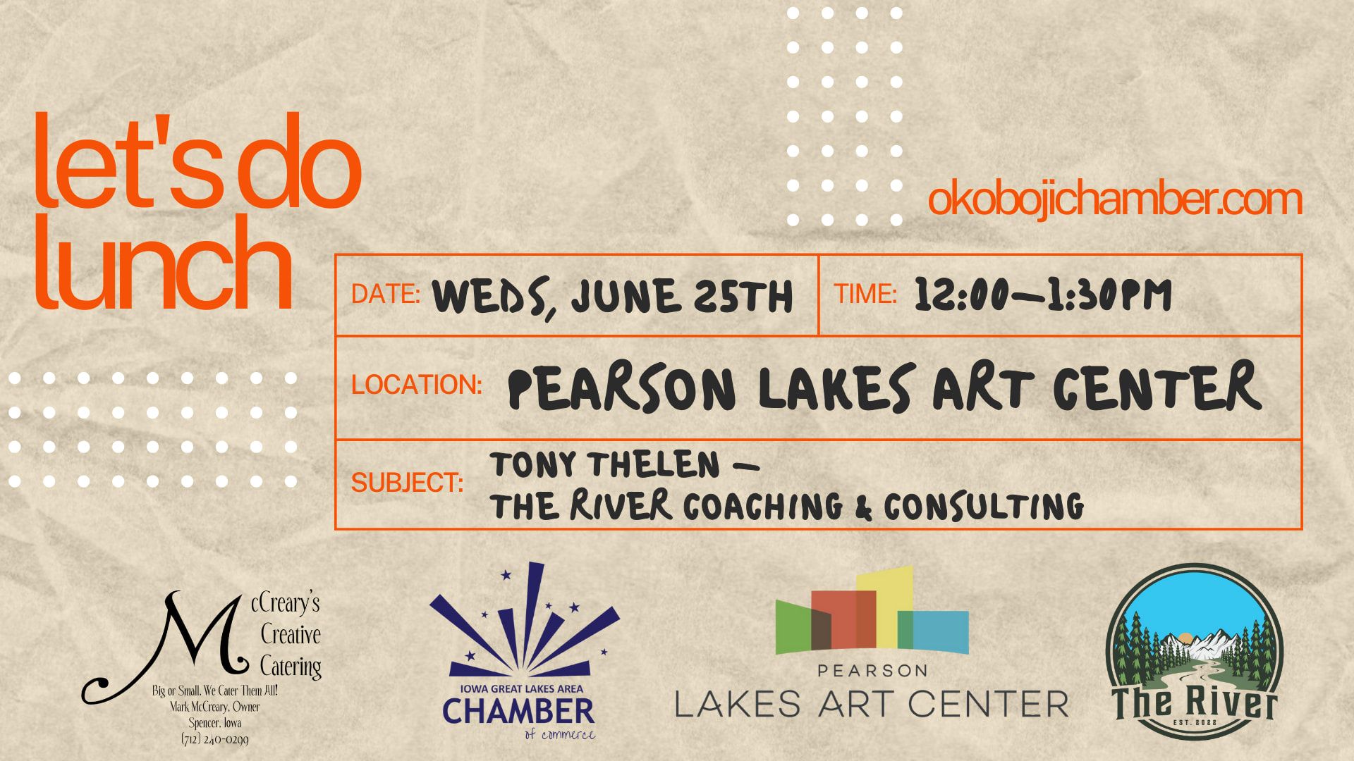 The Iowa Great Lakes Area Chamber is hosting at Pearson Lakes Art Center, Let’s Do Lunch & Learn with Tony Thelen and The River Coaching and Consulting. Are you a leader? Do you want to take your leadership skills to the next level? Or are you looking for how to better manage that work/life balance? Young professionals just starting out? Please join us on Wednesday, June 25th from 12pm-1:30pm for an experience you can take right to your workplace and in your everyday life.Images