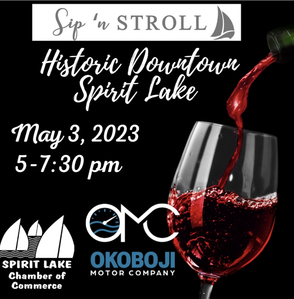MAY THIRD FROM 5 TO 7:30PM IN HISTORIC DOWNTOWN SPIRIT LAKE FOR THE ANNUAL SIP’N STROLL. STROLL THROUGH MANY DOWNTOWN BUSINESSES WHILE ENJOYING FOOD & SAMPLES OF WINE, BEER AND SPIRITS FROM MANY WINERIES, DISTILLERIES AND BREWERIES. TICKETS ARE 25 DOLLARS IN ADVANCE OF APRIL 1ST 30 STARTING APRIL 1ST AND INCLUDES A COMMEMORATIVE GLASS, SAMPLING CARD AND HORS D’OEUVRES AT EACH RETAILER . ONLY 275 TICKETS AVAILABLE. SO, GET YOUR TICKET AND JOIN US FOR THE EVENT OF THE SEASON. SIP’N STROLL 2023 ON MAY THIRD FROM FIVE TO SEVEN IN HISTORIC DOWNTOWN SPIRIT LAKE. PRESENTING SPONSOR ~ OKOBOJI MOTOR COMPANY ~