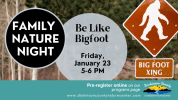 Family Nature Night: Be Like Bigfoot Who: Families When: January 23rd, 5-6 PM Where: Dickinson County Nature Center Cost: Free What to expect: This program occurs on the 4th Friday of every month and features a new topic each time. At this program ...