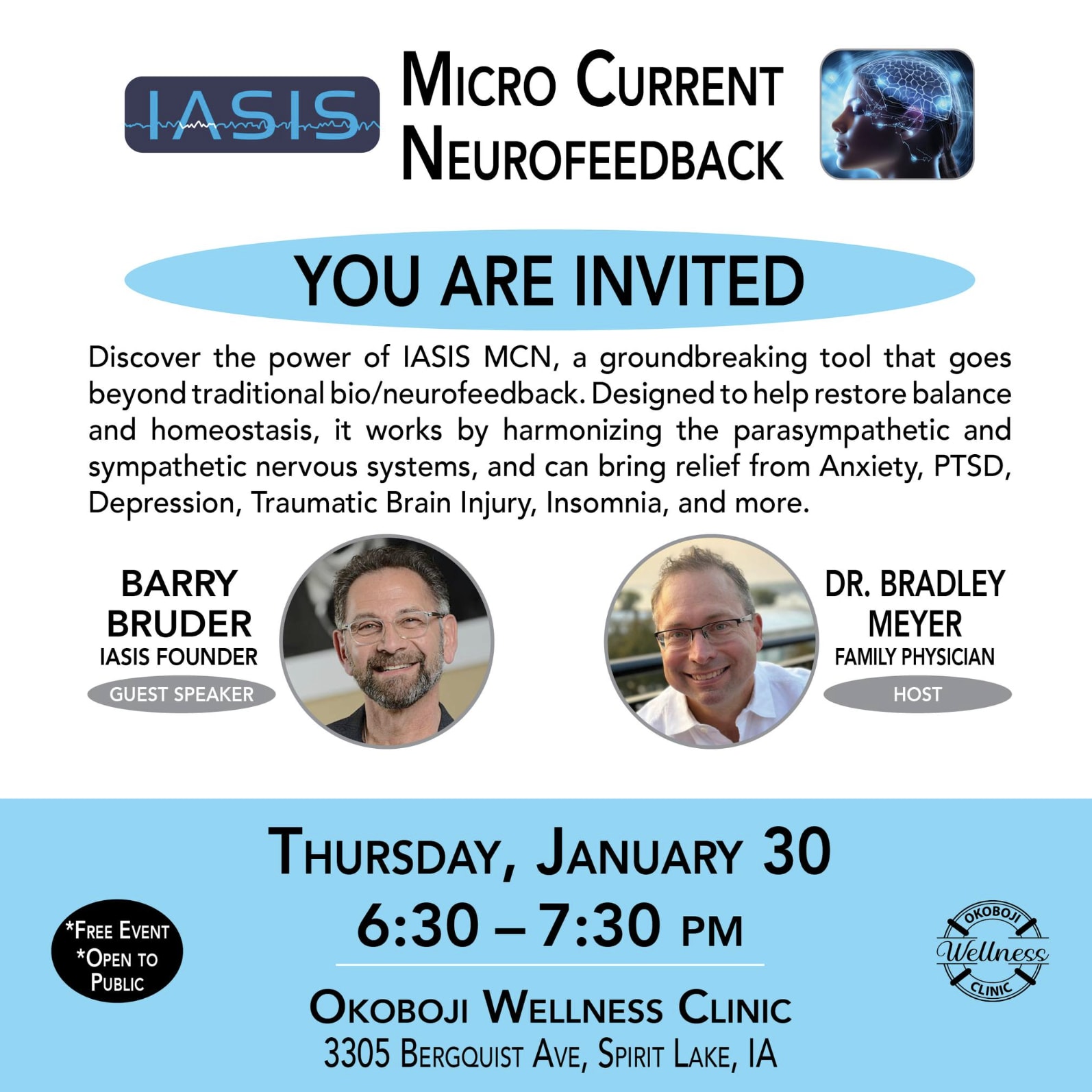 You are Invited! 𝟭 𝗪𝗘𝗘𝗞 𝗔𝗪𝗔𝗬! 🧠 𝗟𝗘𝗔𝗥𝗡 𝘁𝗵𝗲 𝗦𝗰𝗶𝗲𝗻𝗰𝗲 behind this Amazing Wellness Device on January 30! We're seeing immediate results here at Okoboji Wellness Clinic! 𝗜𝗔𝗦𝗜𝗦 𝗠𝗶𝗰𝗿𝗼 𝗖𝘂𝗿𝗿𝗲𝗻𝘁 𝗡𝗲𝘂𝗿𝗼𝗳𝗲𝗲𝗱𝗯𝗮𝗰𝗸 is 𝗧𝗥𝗔𝗡𝗦𝗙𝗢𝗥𝗠𝗜𝗡𝗚 𝗟𝗜𝗩𝗘𝗦 by Restoring balance and relaxation in the nervous system to Enhance gut, heart, and brain connection for Optimal health. 🙌 Call Okoboji Wellness Clinic at (712) 339-6024 with questions about IASIS and to schedule your session.