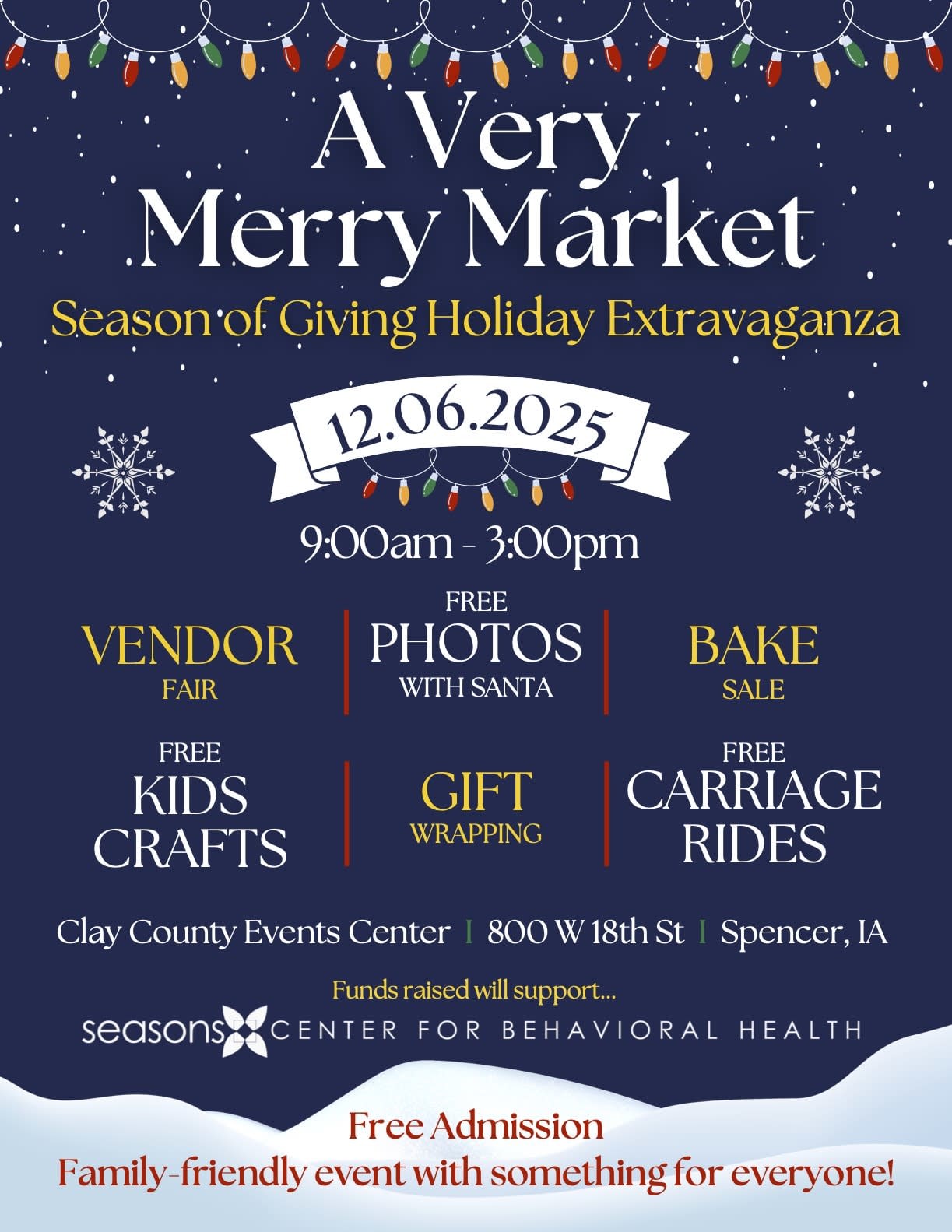 Seasons Center is hosting A Very Merry Market – Season of Giving Holiday Extravaganza on Saturday, December 6th. This family-friendly event will bring together families, businesses, and organizations for a day filled with holiday cheer — all while supporting a meaningful cause. All proceeds from A Very Merry Market will benefit Seasons Center for Behavioral Health. This event is designed to offer something for everyone, with a mix of free and low-cost activities to ensure all can join in the fun. FREE activities include: Santa Photos: kids of all ages can visit with Santa and share their holiday wish lists. Every family will receive one FREE photo with the big guy. Digital photo options will also be available for purchase. Horse-Drawn Carriage Rides: courtesy of The Pony Express Kids Craft & Activity Stations: fun activities provided by ISU Extension, Kiwanis After 5, SHS Key Club, Spencer Reads, and the 4H Rabbit Wranglers Low-cost activities include: Vendor Fair: we currently have over 60 vendors committed, with more signing up every day. Bake Sale: assorted cookie platters, cookie kits, and bake sale items will be for sale at the event. We will also take pre-orders for assorted cooking platters and cookie kits to be picked up closer to the holiday. Gift Wrapping Station: for a minimal charge, we will wrap presents purchased at the event or brought in from elsewhere. Little Elves Shopping Services: our friendly elves will help kiddos shop for gifts for the special people in their lives.