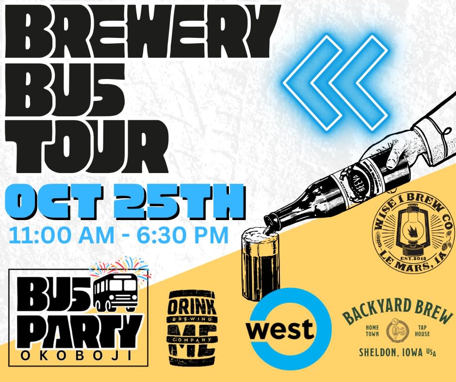 Experience the best of local craft beer on October 25th for Bus Party Okoboji's first Brewery Tour. This full-day adventure begins and ends at West O Beer , with additional stops at Drink Me Brewing Company, Wise I Brewing Company, and Backyard Brew. Tickets are $55 per person and include transportation, guided tours, and onboard cooler space for any beer you’d like to take home. 🎟️ Seats are limited to 35 so book your spot today: buspartyokoboji.com/events
