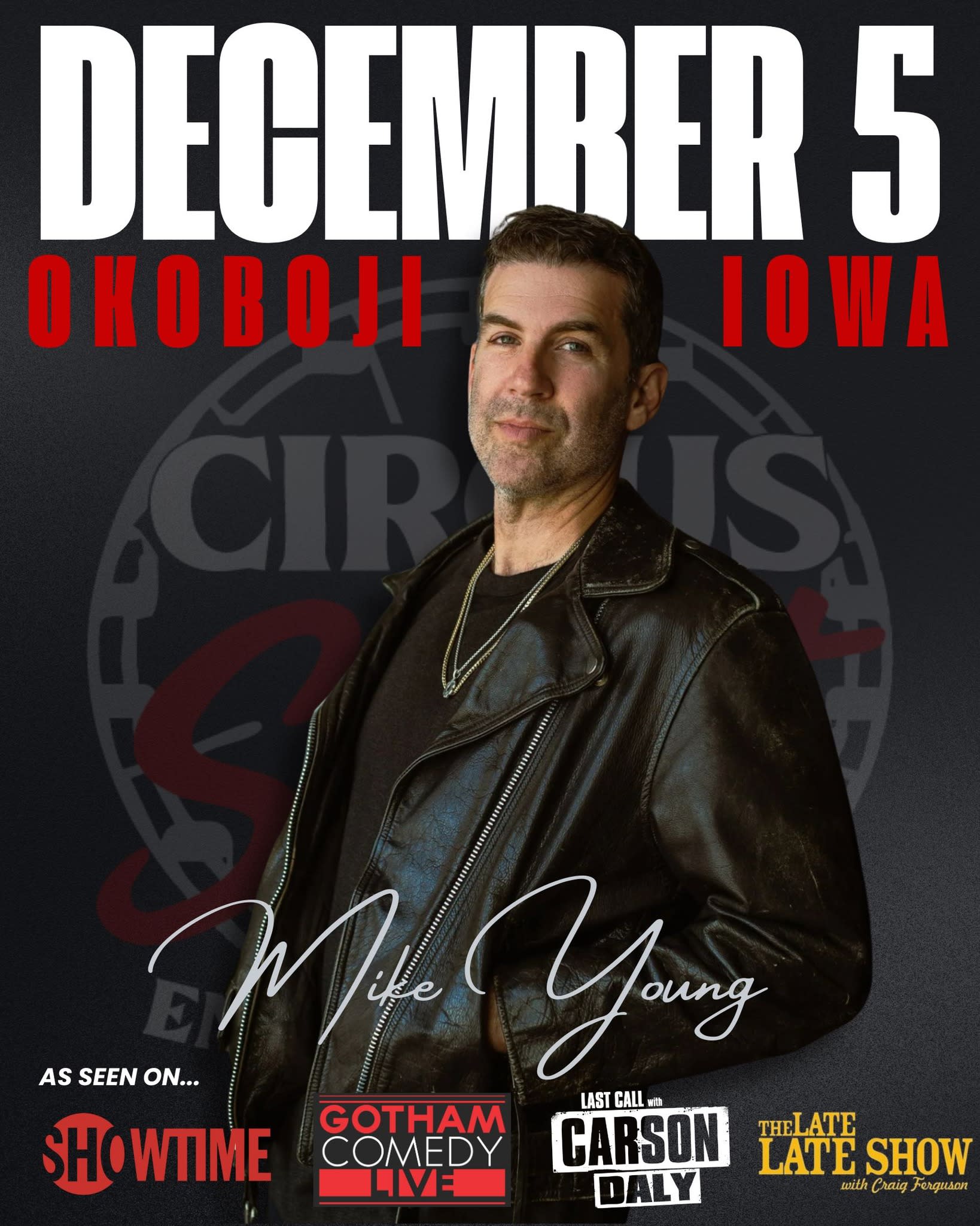 CIRCUS STREET COMEDY BY MIKE YOUNG • Live in Okoboji for TWO nights! • Detroit native Mike Young is an original voice in comedy. After touring with Dave Chapelle, Joe Rogan, Sebastian Maniscalco & Bob Saget, Young headlines nationwide with his down-to-earth stand up. • Mike wrote and directed several feature films, using his comedy voice for the big screen, including 'My Man Is A Loser,' starring John Stamos and Michael Rapaport. 'A Stand Up Guy,' starring Ethan Suplee, Jay Ferguson and Danny A went to Netflix and currently Stealing Jokes starring Josh Segarra and Orlando Jones is in production in Detroit. • After seeing Mike Young on stage at The Comedy Store, actor Tobey Maguire approached him to develop a sitcom entitled Forever Young based on Young’s life in Detroit and sold the idea to ABC. Maguire and Young teamed up again, this time with HBO for a half hour dramedy entitled The Light with writer Chris D’Arenzo of Rock of Ages notoriety. • Mike Young will be in Okoboji Friday, December 5th & Saturday, December 6th. Tickets available online: www.circusstreetentertainment.com 🎟️ 📅 Friday, December 5th | 8:00 PM 📍 Circus Street at Drake's Oak Hill - 2188 | 2188 Hwy 86, Milford, IA