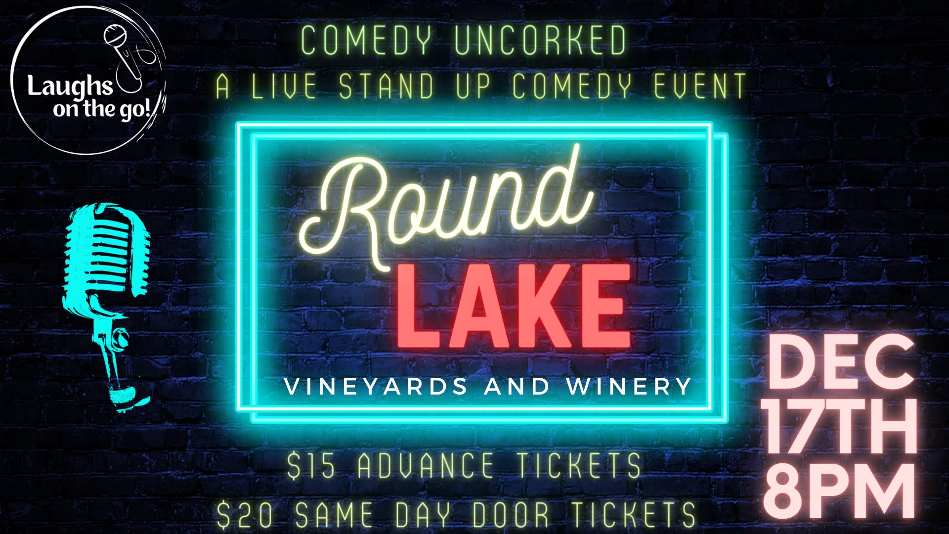 Laughs on the Go! presents a unique night out featuring the finest that comedy has to offer, paired with Round Lake’s signature wines! A Live Stand Up Comedy Event! We've hand-picked some of our favorite stand-up comics from around the country to perform secret, one-night-only shows at special venues across the country! We bring the best comedians to local venues for evenings that keeps the drinks flowing, and the laughs coming. We provide the absolute funniest in comedy entertainment, with our comics having credits at top festivals, on TV, and in major national and international clubs. All you need to do is come ready to laugh. Tickets:$15.00 Advance, $20.00 Same Day/At The Door Show Starts at 8pm! Seating will be cabaret style – first come first serve, dinner reservations are encouraged prior to the show at The Bistro (no food will be served at the show – just cash bar). Doors open 1 hour prior to show start time. Arrive early to grab a drink (or two) and pick your seat!