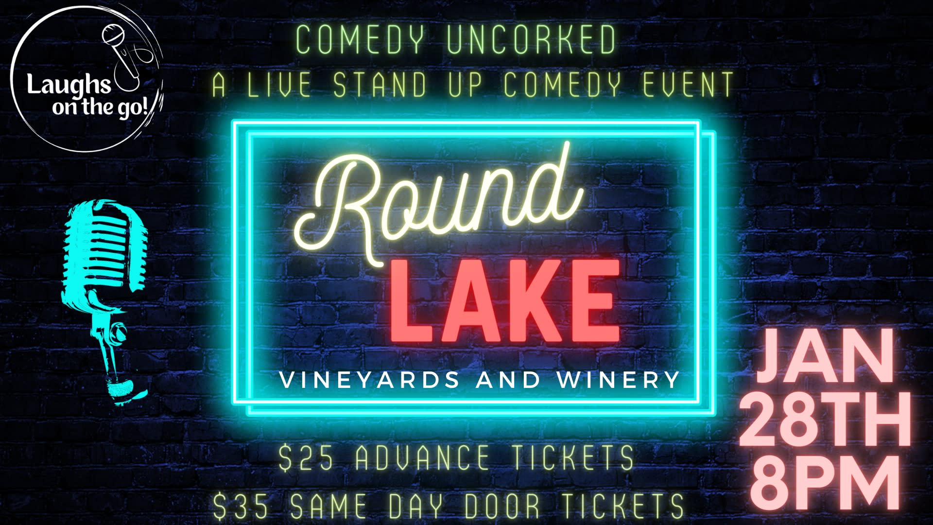Laughs on the Go! presents a unique night out featuring the finest that comedy has to offer, paired with Round Lake’s signature wines! A Live Stand Up Comedy Event! We've hand-picked some of our favorite stand-up comics from around the country to perform secret, one-night-only shows at special venues across the country! We bring the best comedians to local venues for evenings that keeps the drinks flowing, and the laughs coming. We provide the absolute funniest in comedy entertainment, with our comics having credits at top festivals, on TV, and in major national and international clubs. All you need to do is come ready to laugh. Tickets:$15.00 Advance, $20.00 Same Day/At The Door Show Starts at 8pm! Seating will be cabaret style – first come first serve, dinner reservations are encouraged prior to the show at The Bistro (no food will be served at the show – just cash bar). Doors open 1 hour prior to show start time. Arrive early to grab a drink (or two) and pick your seat!