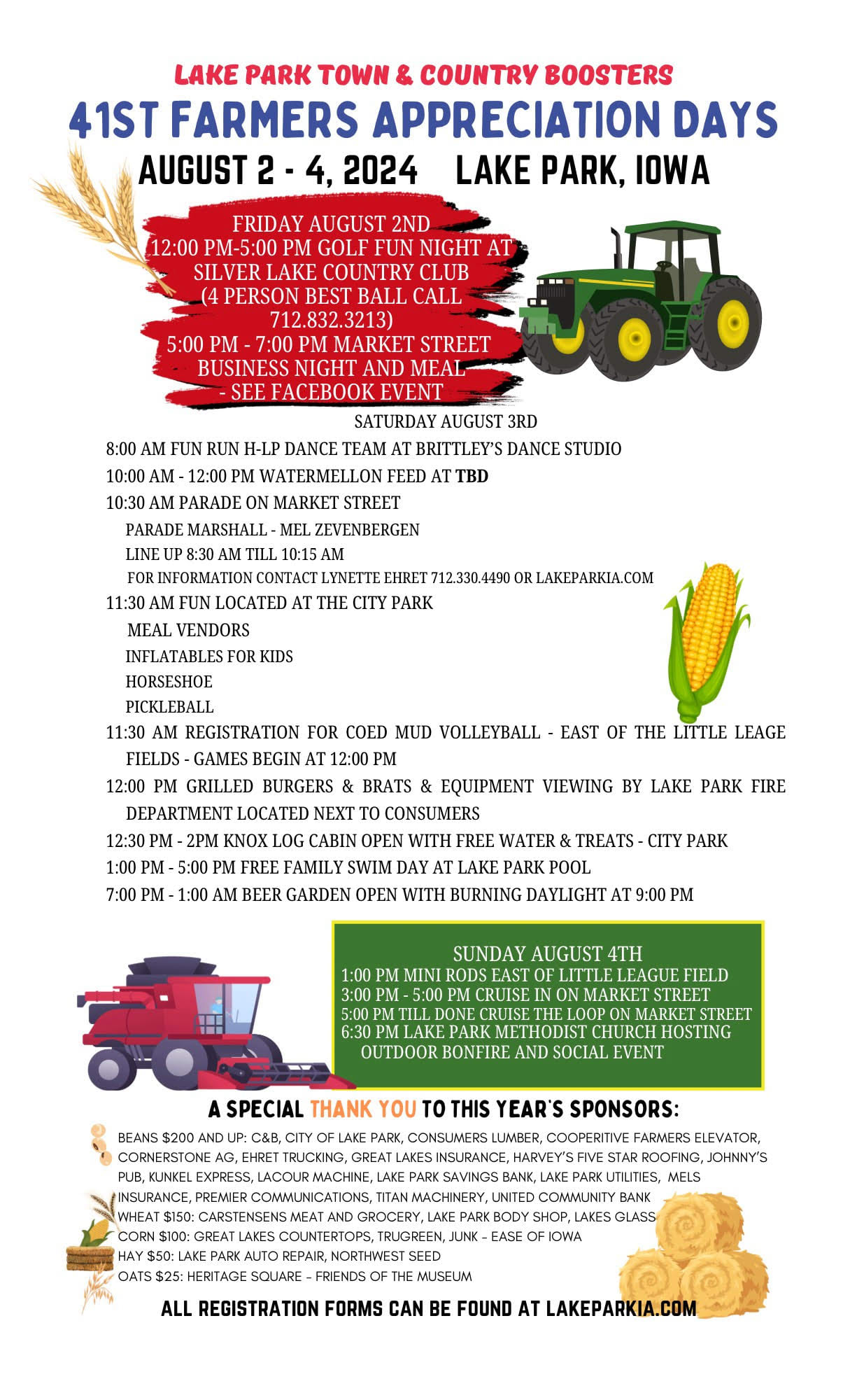 Don't miss out on the Farmers Appreciation event in Lake Park, Iowa from Aug 2-4! There will be tons of fun activities including mud volleyball, golf tournament, shopping, delicious food, music, candy, kids' activities and one of the largest parades in northwest Iowa.