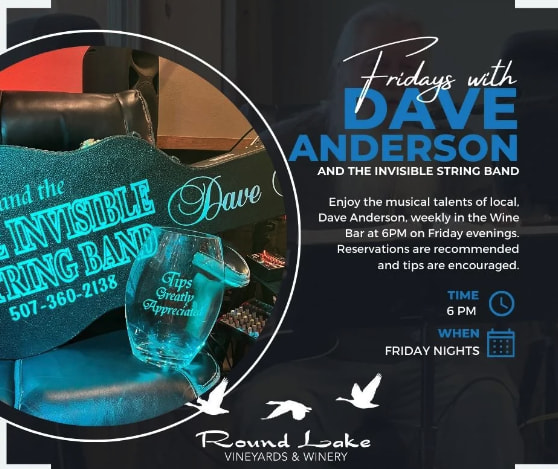 Enjoy the musical talents of local, Dave Anderson, weekly in the Wine Bar at 6PM on Friday evenings. Reservations are recommended and tips are encouraged.