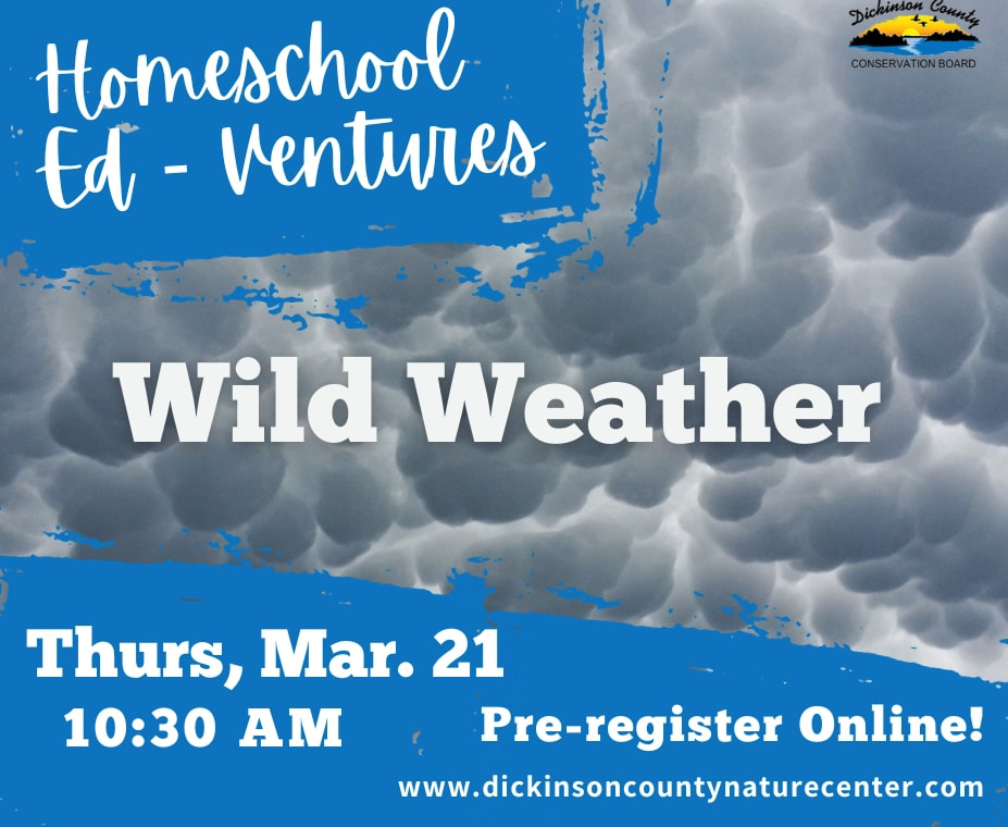 Learn what causes weather and how to stay safe during severe storms. Homeschool Ed-ventures is a free program intended for homeschooled children ages 5-12. This program occurs on the 3rd Thursday of the month during the school year from 10:30 a.m. to 11:30 a.m. Prepare to be dressed for the outdoor weather. Pre-registration opens 2 months prior at 8:00 a.m. and closes 2 days prior to the program at 5 p.m. Please call, 712-336-6352, if you have any questions.