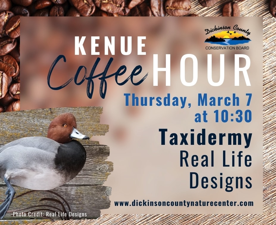 Real Life Designs will be presenting about the process of taxidermy. Kenue Coffee Hour is a free adult program held on the 1st Thursday of the month at 10:30 a.m. Each month will have an outdoor or nature-related theme and a light beverage bar is served. No registration is required for this program.