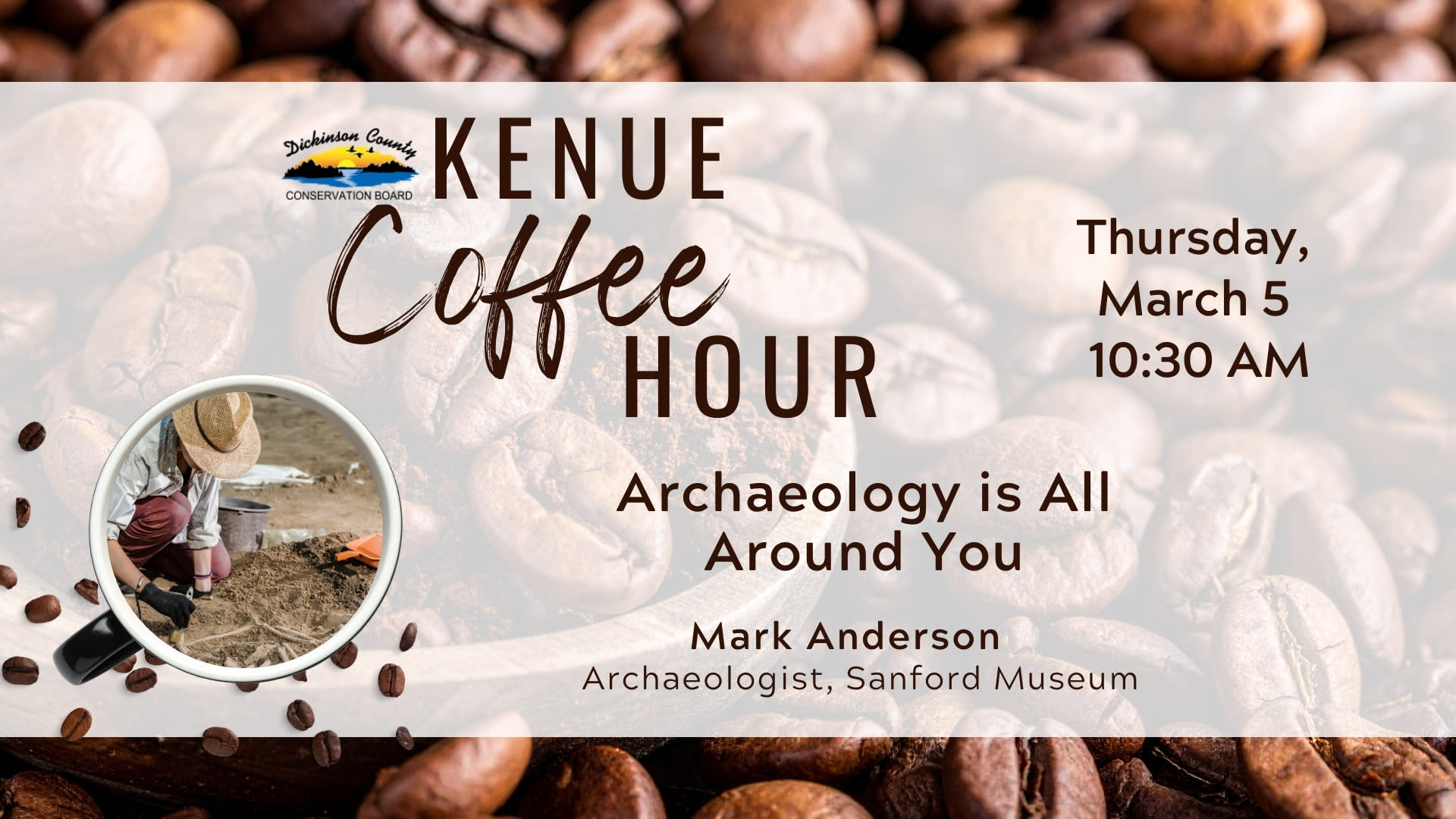 he Dickinson County Nature Center invites adults to enjoy a hot cup of coffee at Kenue Coffee Hour to listen to Mark Anderson, an archeologist at the Sanford Museum. The event will take place at the Maser Monarch Lodge on March 5th at 10:30 a.m. Anderson’s presentation 'Archaeology is All Around You: A Culture History of Dickinson County, Iowa,” will explore what an archaeologist is and the important work that uncovered stone tools, arrowheads, pottery shards and other artifacts from the last 14,000 years of human history in Iowa. Kenue Coffee Hour is a monthly program held on the first Thursday of the month where a speaker presents on a conservation- or nature-related topic. Pull up a chair and enjoy conversations around a table. No registration is required to attend, and more Kenue Coffee Hour topics can be found at dickinsoncountyconservationboard.com under the Programs/Events tab.