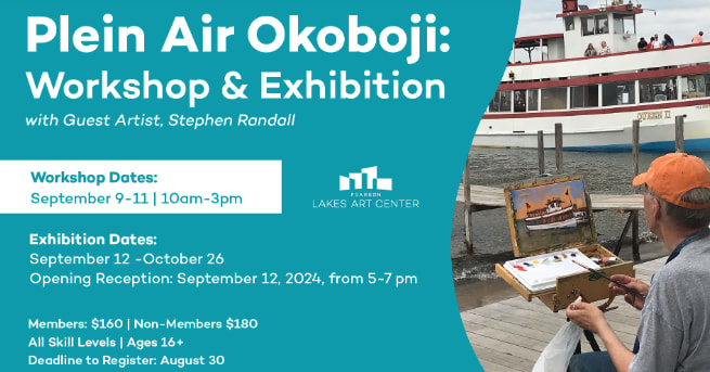 Okoboji Plein Air Workshop & Exhibition With Steven Randall September 9-11 | 10am-3pm | $160/$180 Opening Reception: 9/12 from 5-7pm Level: All Levels, 16 years + Deadline to Register: August 30 Whether you are a beginner or a professional artist, join us in this 3-day Okoboji Plein Air workshop painting the beauty of the Iowa Great Lakes!