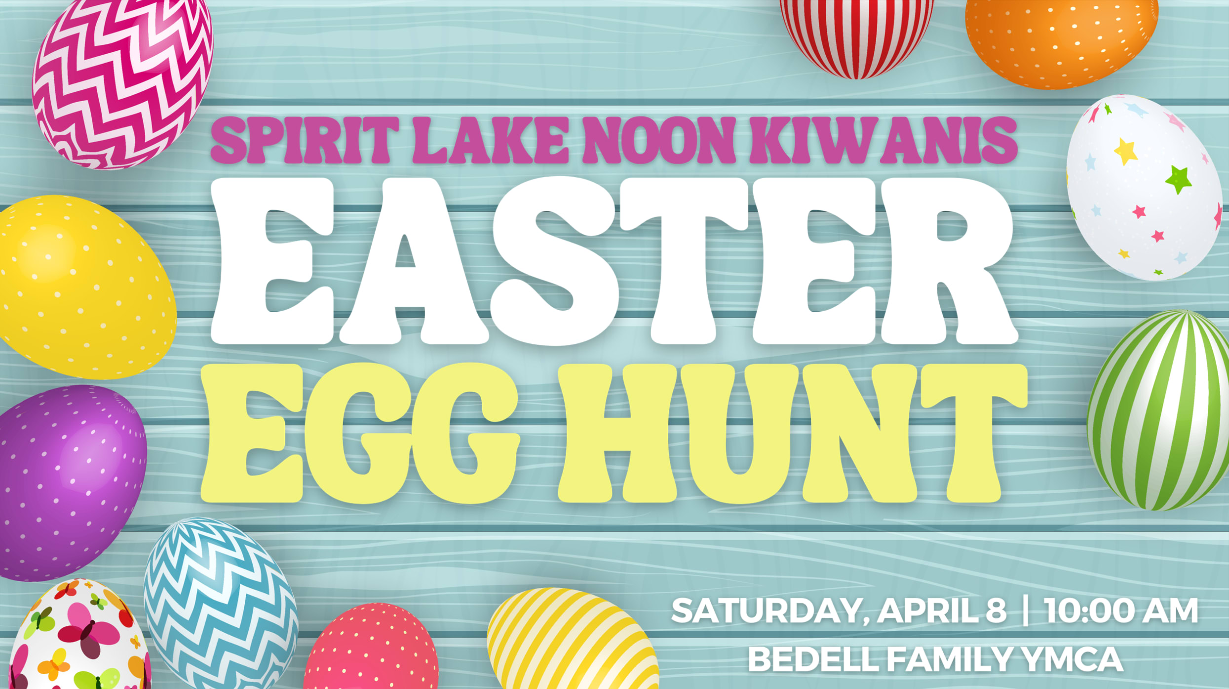 Hop to it and great ready for The Spirit Lake Noon Kiwanis Club's Annual Easter Egg Hunt on Saturday, April 8th at 10:00AM at Bedell Family YMCA. This is a FREE event open to the public. Please arrive by 10:00AM to ensure that you do not miss out on this fun, fast paced hunt! Bring your basket and have some fun with us. There will be 3 different age divisions: 2 & under, 3-5 years, & 6-8 years. Hoppy Easter Everyone! The event will be on the Bedell Family YMCA Soccer Fields. If weather becomes an issue the hunt will be moved inside to the YMCA gyms.