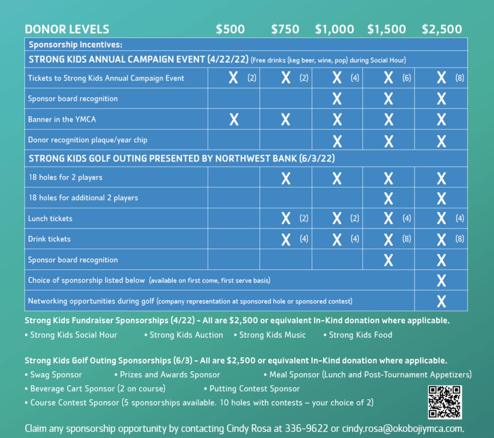 Tournament Information • Teams will be comprised of 4 golfers • 12pm shotgun start, check in begins at 11am • 8 inch cup, best ball format • Optional putting contest We’re excited to announce the YMCA’s annual golf fundraiser going to be held as planned. Spots still available – first come, first served! Interested in participating? Contact Cindy Rosa at 712-336-9622, cindy.rosa@okbojiymca.com.Images
