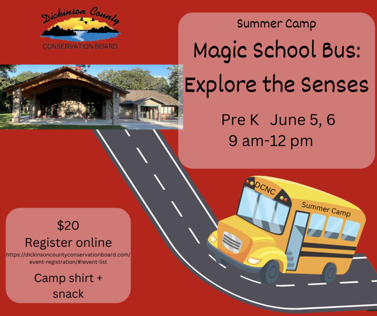 Pre K Summer Camp June 5,6 The Magic School Bus Explores the Senses Fee:$20 This two day drop off camp is from 9 am -12 pm. and will be held outside in Kenue Park. Base camp for drop off and pick up will be at the Maser Monarch Lodge in Kenue Park unless noted. Please make sure your camper is prepared to be outside upon drop off; sunscreen, water bottle, proper shoes, etc. Campers will get a camp shirt and one snack. Registration starts March 1. Register for the age your child is going into. No refunds for cancellations 7 days before camp starts, this will forfeit your camp t-shirt.