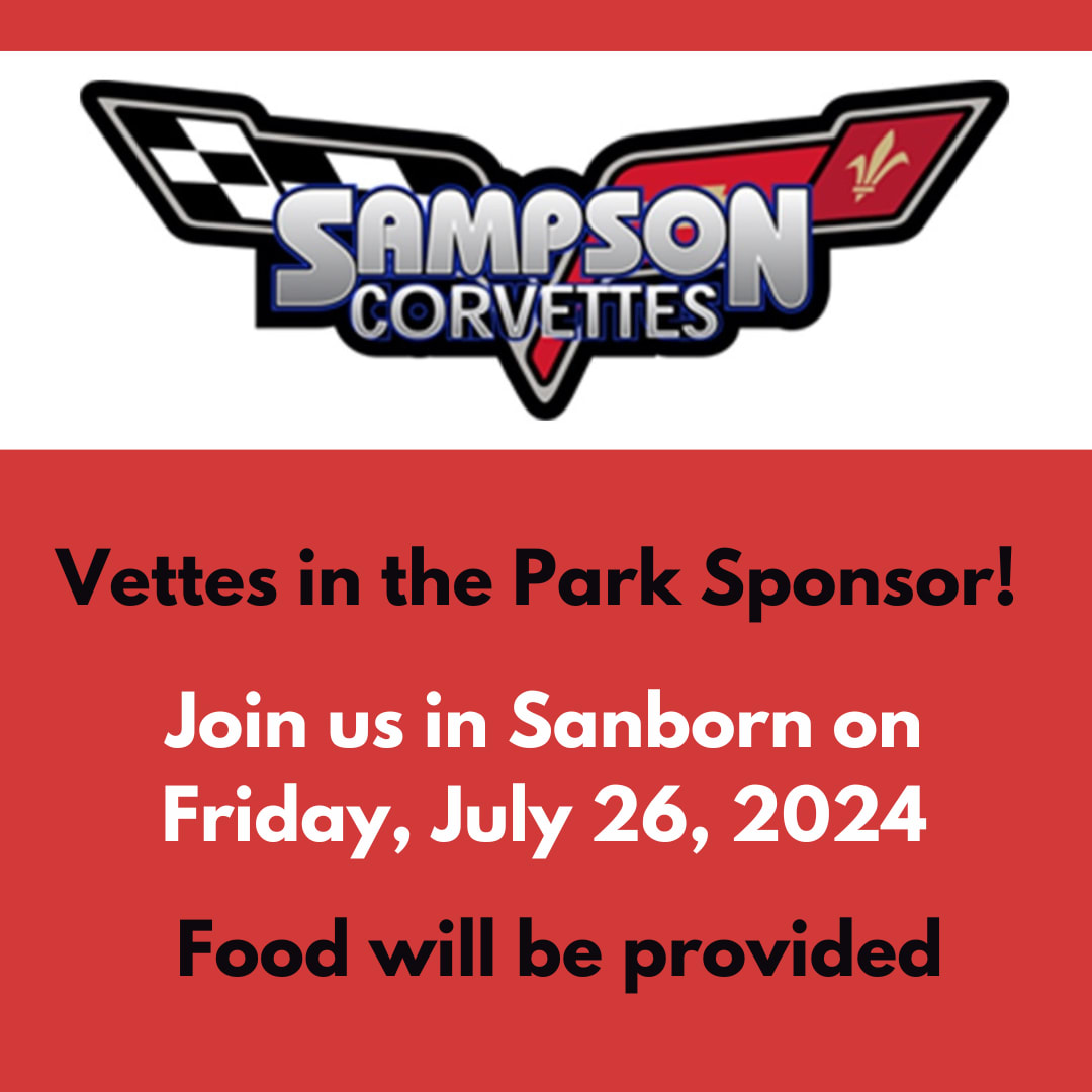 Come hang out at Sampson Corvettes (our Vettes in the Park sponsor) in Sanborn on Friday, July 26th from 11 AM - 3 PM. Enjoy food and buy some Vettes in the Park merch!