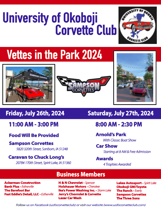 Join us on Saturday, July 27th for this Corvette-only event at Arnold’s Park! Starts at 8 AM- stop by registration to sign in and get your front dash certificate. T-shirts and other clothing items will be for sale and raffle tickets will also be available for purchase to win one of this year's trophies! Other trophies will be awarded at 2:15 PM.Images