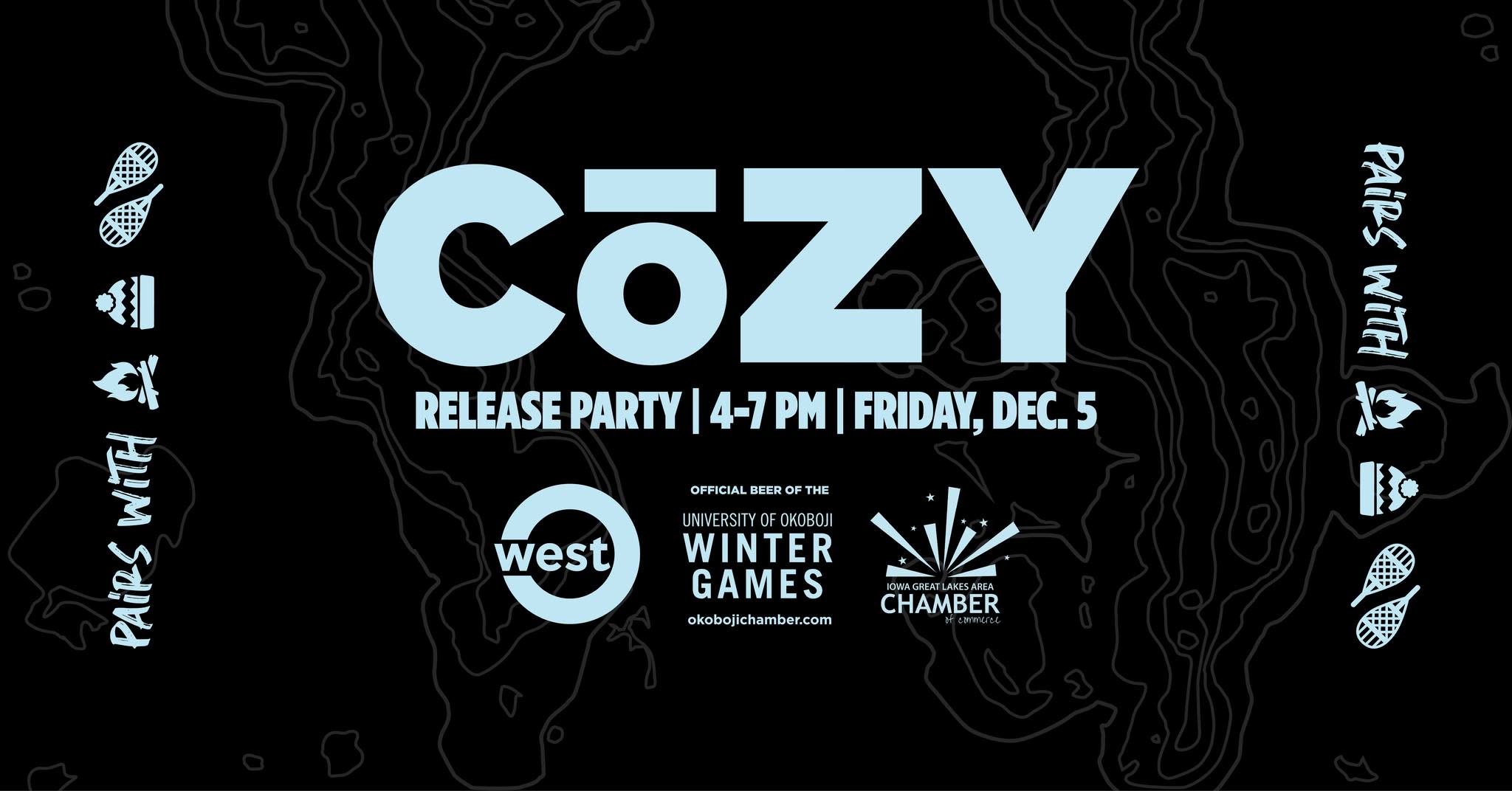 Celebrate the release of CōZY with West O Beer and the Iowa Great Lakes Area Chamber of Commerce! This rich and malty Czech Dark Lager — THE OFFICIAL BEER OF THE UNIVERSITY OF OKOBOJI WINTER GAMES — is packed with comforting notes of roasted chocolate, smooth coffee, caramel, toffee and toasted bread — medium-bodied, full of flavor and never too heavy. It’s the perfect beer to welcome winter in all its glory and to kick off the excitement of the University of Okoboji Winter Games! Join us for a cozy evening of great beer, good company and local pride. Plus, the Chamber will have select Winter Games merch on hand to help you gear up for the season — and we're selling CōZY pints for $5 each and taking $10 off every case of CōZY cans to-go!